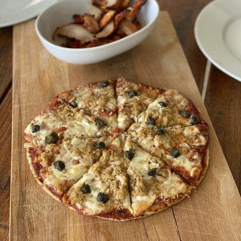 Sauce tomate, mozzarella, thon, champignons, œuf, crème fraîche