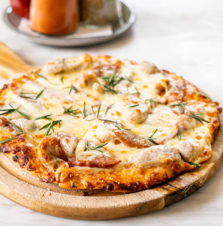 Sauce tomate, mozzarella, chorizo, jambon, poulet, merguez, chicken tikka, crème fraîche