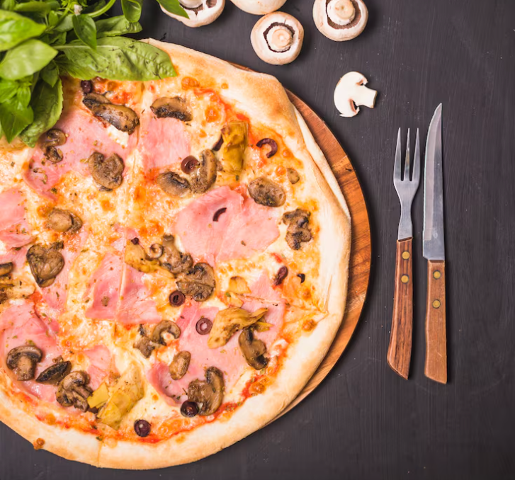 Crème fraîche, sauce tomate, mozzarella, jambon, champignons, œuf