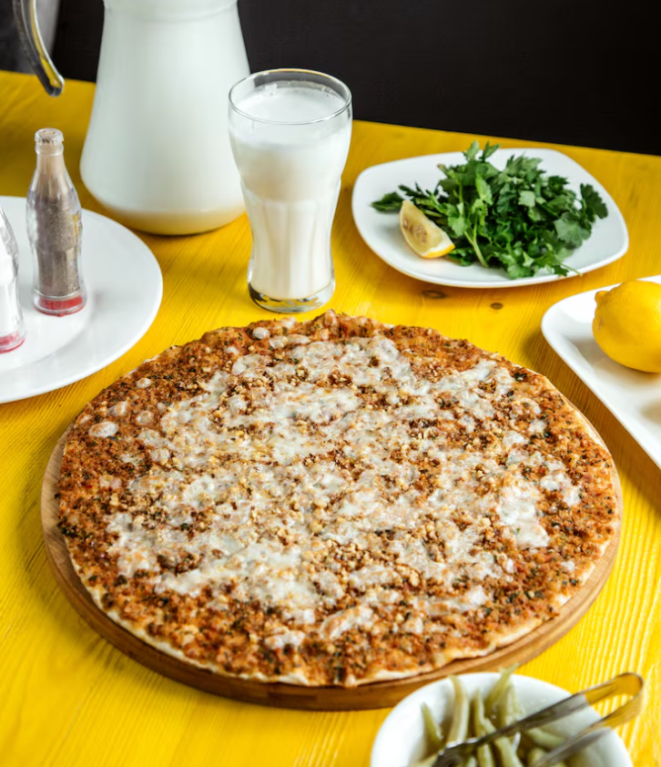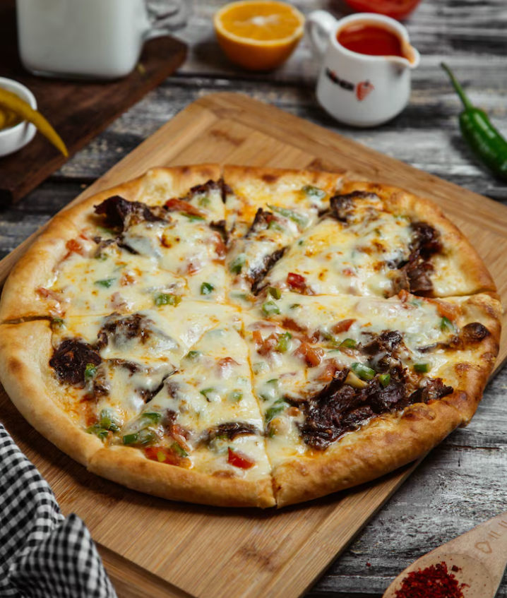 Sauce tomate, mozzarella, viande hachée, jambon, merguez, chèvre