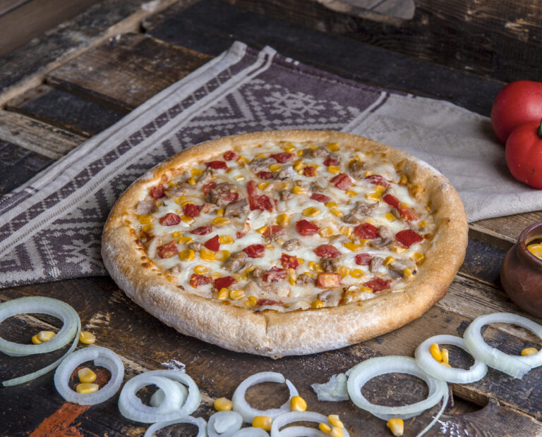 Sauce tomate, mozzarella, viande hachée, chorizo, oignons, champignons, poivrons
